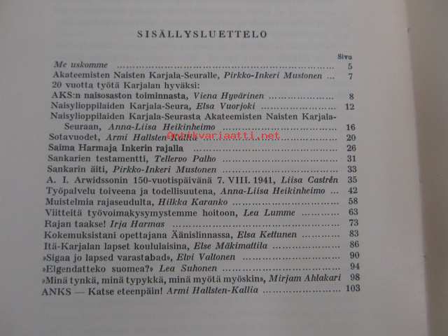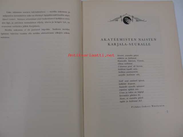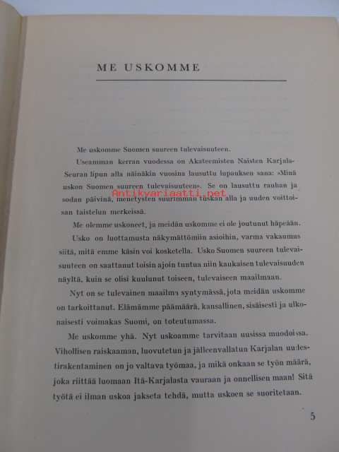 Me uskomme. Naisylioppilaiden Karjala-seuran 15-vuotisjulkaisu. /Naisylioppilaiden Karjala-Seura (NYKS, vuodesta 1938 Akateemisten Naisten Karjala-Seura, ANKS) oli