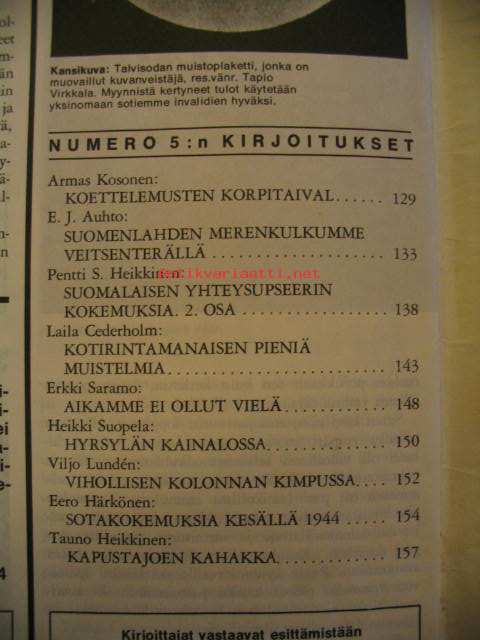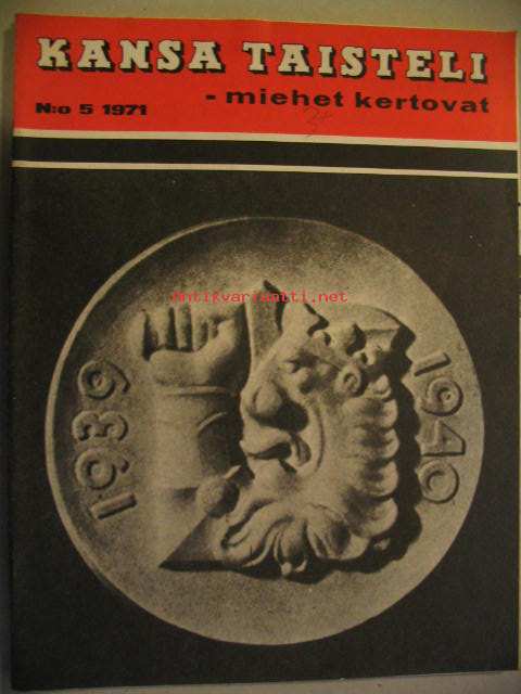 Kansa Taisteli 1971 nr 5 . Kapustajoen kahakka. Vuosalmi taistelu 1944. Viljo Lundén kirjoittaa Leipäsuon tienoilta, kuvissa mm Uudenkirkon parantola. Heikki Suopela : Hyrsylän kainalossa . Erkki saramo kirjoittaa Porajärven tienoilta 1941. In memorian Kustaa Anders Tapola. Laila Cederholm kirjoittaa Oulun pommituksista, 3 kuvaa raunioista. E.J Auhto Miinanraivaus aihe, useita kuvia.
