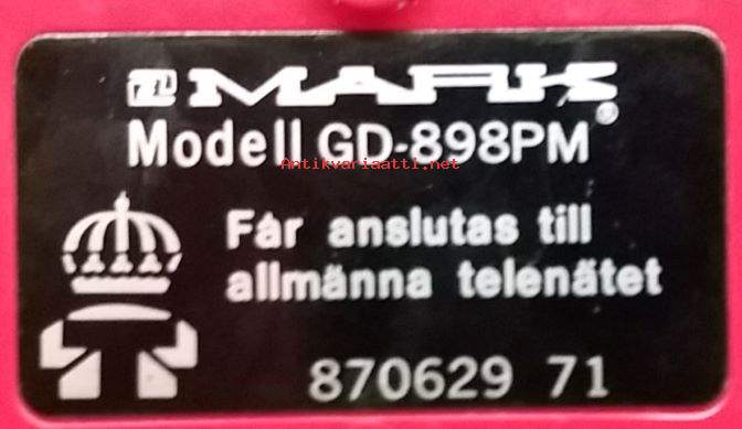 Muovikuorinen näppäinpuhelin on puolipastillinmuotoinen. Malli GD-898PM. Sarjanumero 870629 71. Leveys 21 cm. Olisiko vuosiluku 1971 ?