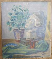 Tuntematon taiteilija, "Asetelma" öljyvärimaalaus kankaalle sign ÅL 1958 koko 46x41 cm kehystämätön