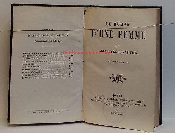Guatre Femmes v. 1856, Tois Hommes Forts v. 1858, Diane de Lys + Ce Qu`on Ne Sait Pas + Grangette + Une Loge A Camille v.1862, D`Une Femme v. 1863, La Boite D´Argent + Un Paguet de Letters + Le Prix de Pigeons + Le Pendu de La Piroche + Ce Que L´on Voit Tous Les Jours + Cèsarine + v. 1867, Sopihie Printems v. 1866, Affaire Clèmenceau v. 1866, Tristian le Roux v. 1866, La Dame Aux Perles v. 1867, Le Docteur Servans + Un Cas de Rupture v. 1868, La vie A Vingt Ans v. 1869, Le Règent Mustel v. 1869 Kahtenatoista eri niteenä. Dimensiot 18 ¤ 11 cm. Leima: poistettu JKL:n yliopisto.