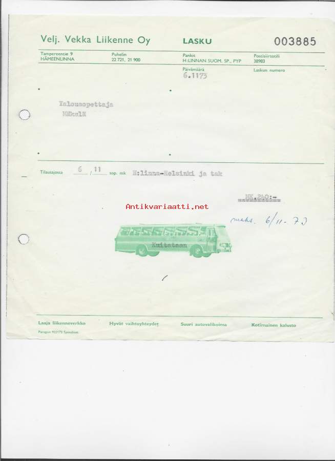 Velj Vekka Liikenne Oy, Hämeenlinnna 1973 - firmalomake
