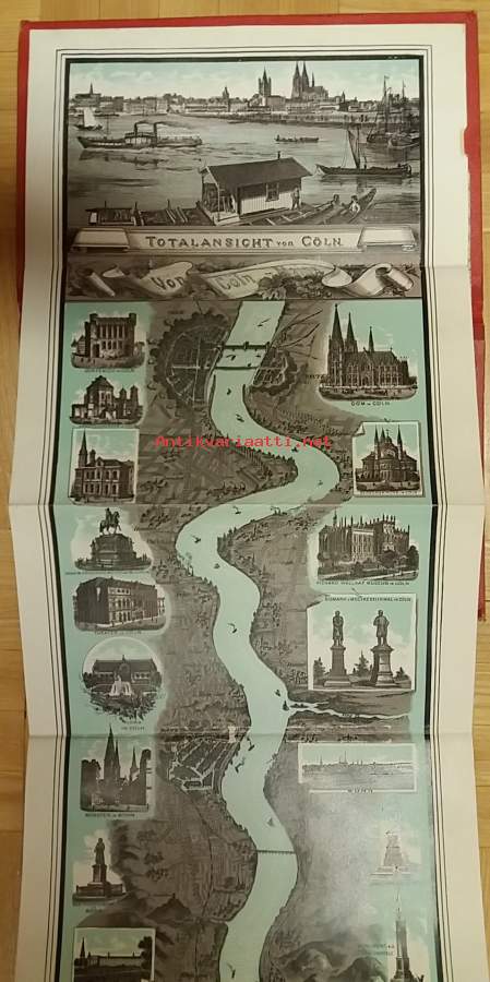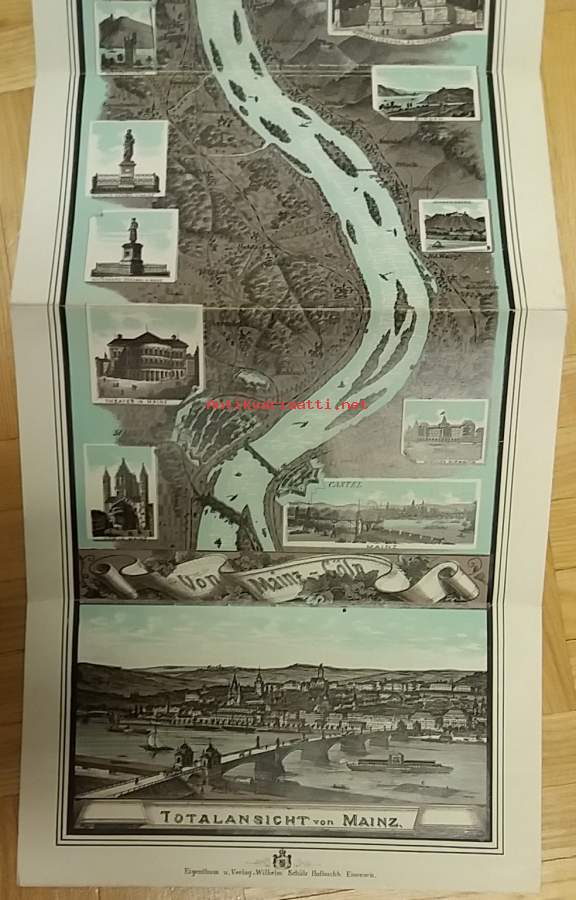 Erläuternder Text zum Rhein-Panorama von Mainz bis Cöln. Herausgegeben von Wilhelm Schütz. Tekstit saksaksi, englanniksi ja ranskaksi. Kaikissa sama sivumäärä eli 9. Kuvan pituus noin 130 cm ja leveys 17,5 cm. Kannen dimensiot 12 ¤ 18 cm.