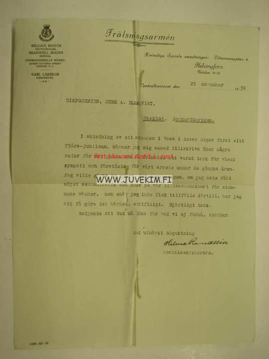 Frälsningsarmén 25.11.1930 Helsingfors -asiakirja