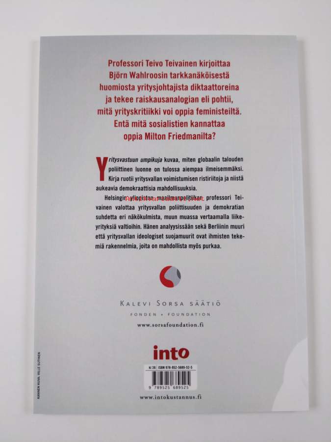 Sarja: Kalevi Sorsa-säätiön julkaisuja 1/2013Asiasanat: demokratia, yritykset, valta, kansainvälinen politiikka, vallankäyttö, kapitalismi, yhtiöt, suuryritykset, globalisaatio, yritysdemokratia, yhteiskuntavastuu, yritysvastuu, demokrati, internationell politik, företagsansvar