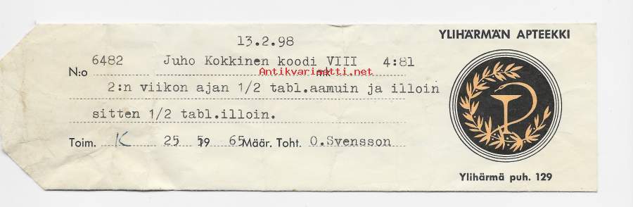 Ylihärmän Apteekki Ylihärmä resepti signatuuri 1965