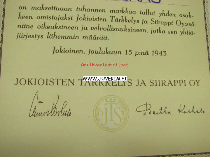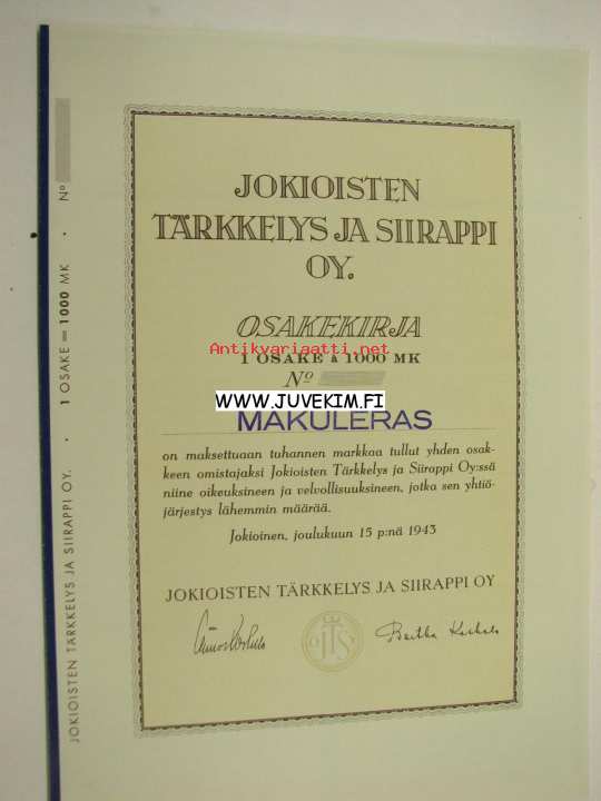 Jokioisten Tärkkelys ja Siirappi Oy, Jokioinen 1943 1 000 mk -osakekirja