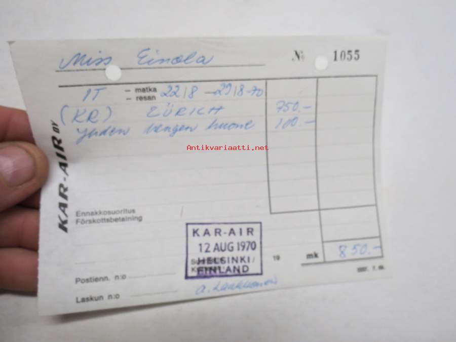 Kar-Air Oy 22.8.1970 Zürich -matkalippukuitti