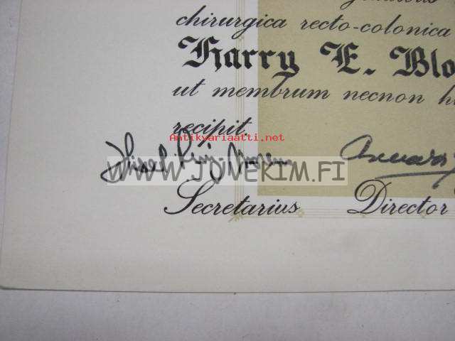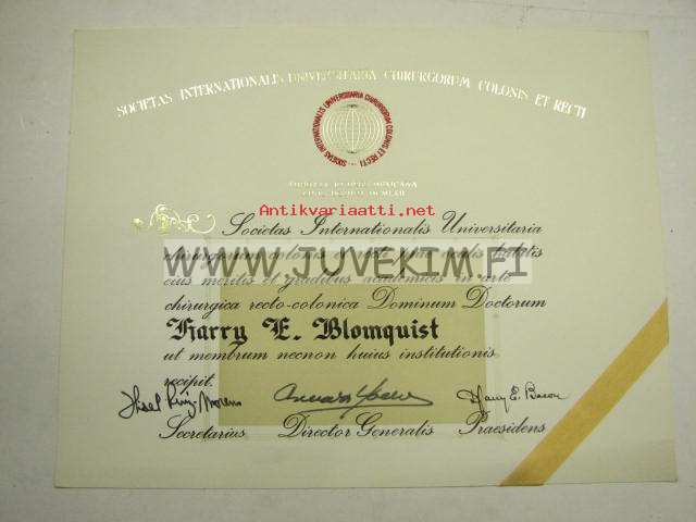 Societas Internationalis Universitaria chirurgorum colonis... diploma... doctor Harry E. Blomquist -diplomi