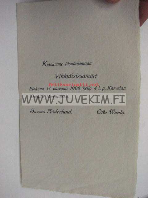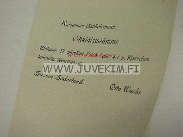 Vihkiäiskutsu 17.8.1906 Suoma Söderlund, Otto Wuola Karvela, Marttila