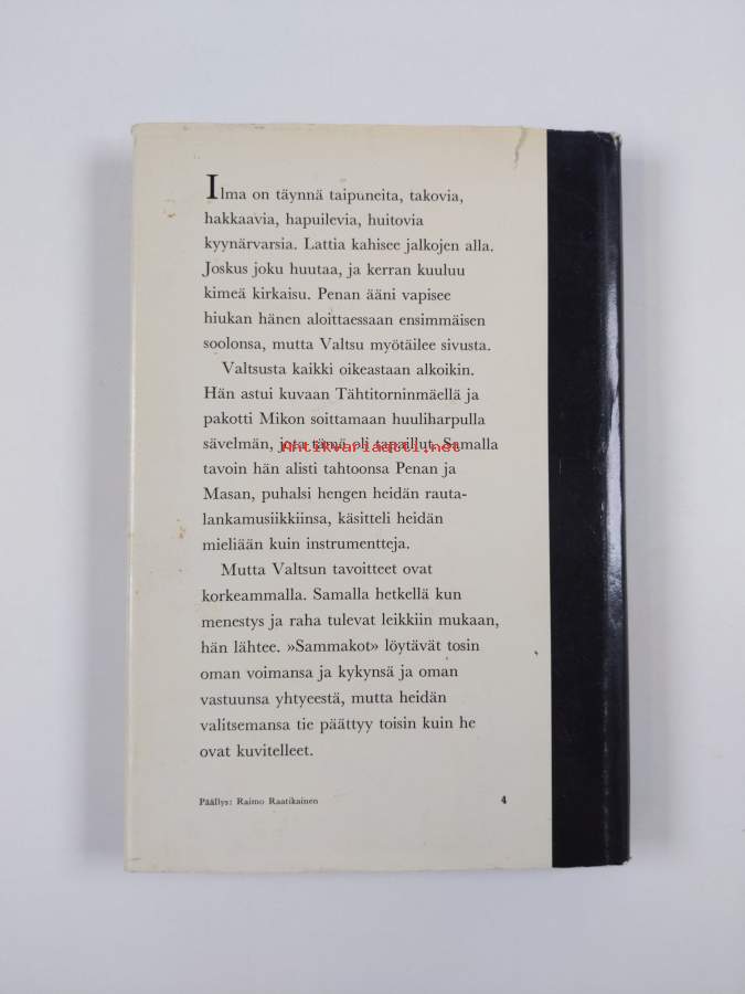 Hyvä. Pienoista kulumaa, selkämyksessä aavistus vinoutta. Kansipaperin kunto: jonkin verran kulumaa/pienoisia repeämiä
