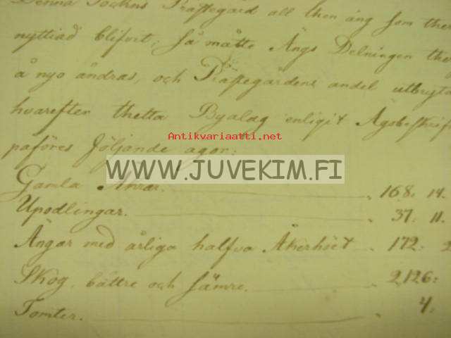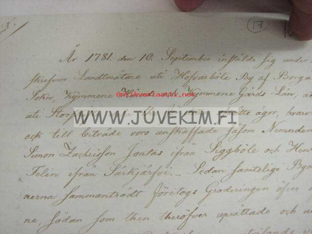 Isoonjakoon liittyvä maanmittaus 10.9.1781, maanmittari T. Winter, Porvoon pitäjä (nyk. Askola, Hovarböle, lautamiehet SimonZachrisson Jontas (Siggböl