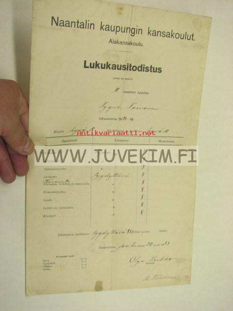Naantalin kaupungin kansakoulu Alakansakoulu Lukukausi-todistus syyslukukausi 1923 Tyyne Toivonen
