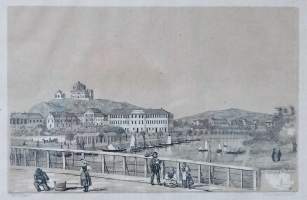Turku näkymä Tuomiokirkkosillalta alajuoksulle Nikolaintorin rantaa ja Pinella 1855 - litografia V Stranski / Presso ColomboCoen lib