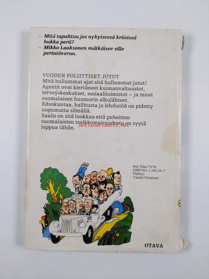 Hyvä. Hieman kulumaa, pienoista tahraisuutta kansissa, pienoista kolhua reunoilla ja kulmissa, selkämyksessä hieman vinoutta. Kansipaperin kunto: repeämiä/kulumaa