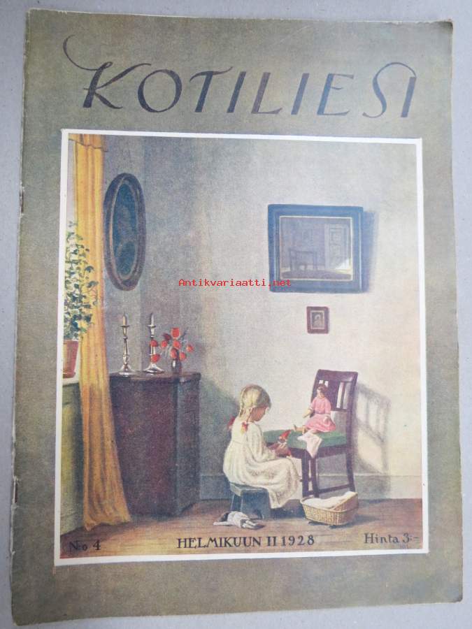 Kotiliesi 1928 nr 4, Kansikuva Alfred Broge - Nukke ja tyttö, Kotitalous ja kansainvälinen toiminta, Huonompi kuin muut, Sophie Mannerheim muistokirjoitus, Pellavat
