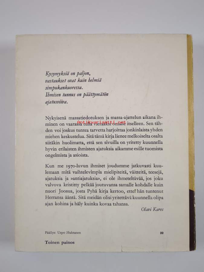 Hyvä. Tarkempi kuntoluokka: K3- ; Hieman kulumaa kansissa, muutamalla sivulla lyijykynämerkintöjä, selkämyksessä hieman vinoutta, selkämyksessä lukutaittumaa. Kansipaperin kunto: joitain repeämiä/kulumaa