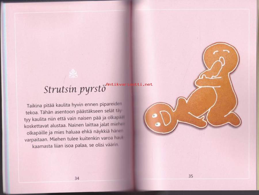 -Tässä huumorilla höystetyssä kirjassa Kama Sutra kohtaa kokkaamisen riemut.-Koko 18 x 12 cm.-Rakastavaisille, seikkailunhaluisille, uteliaille, leipureilleRakastelun reseptit ovat yhtä nautittavia sekä aloittelijoille että asiantuntijoille. Piirrä pipareiden asennot ensin paperille ja leikkaa mallit irti. Apuna voi käyttää Kama Sutran asento-opasta tai alla mainittua kirjasta.Kokeile, haluavatko piparit keinua, riippua, syleillä toisiaan käärmeen lailla, leikkiä kottikärryjä vai pihtejä. Nostele, levitä ja muotoile taikinaa ja koristele lopputulos kuorrutteella. Pipari Sutraa varten tarvitset1,25 dl siirappia (tummaa tai vaaleaa)2 rkl maitoa4 rkl suolatonta voita0,6 dl sokeria5 dl vehnäjauhoja1/2 tl soodaa1 tl inkiväärijauhetta(laita vapaasti lisää, jos haluat enemmän makua)1 tl jauhettua neilikkaa1/2 tl kanelijauhetta1/2 tl jauhettua muskottia1/2 tl suolaaValkoista kuorrutetta, nonpaparelleja ja rakeita koristeeksi. Ohje riittää noin 16 piparihahmoon (koko 12 cm x 9 cm).
