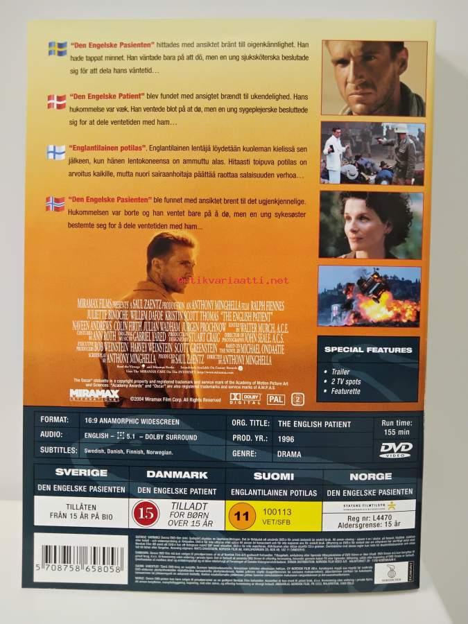 Ralph Fiennes, Juliette Binoche, Willem Dafoe, Kristin Scott Thomas, draama, suomitekstit, v.1996, 155min, levy hieman käytön jälkeä, käytetty hyväkuntoinen