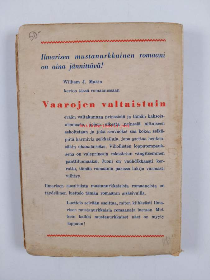 nimiösivu liimaantunut kiinni etukanteen ; viimeisen sivun selkämyksen puoleisella reunalla repeämä