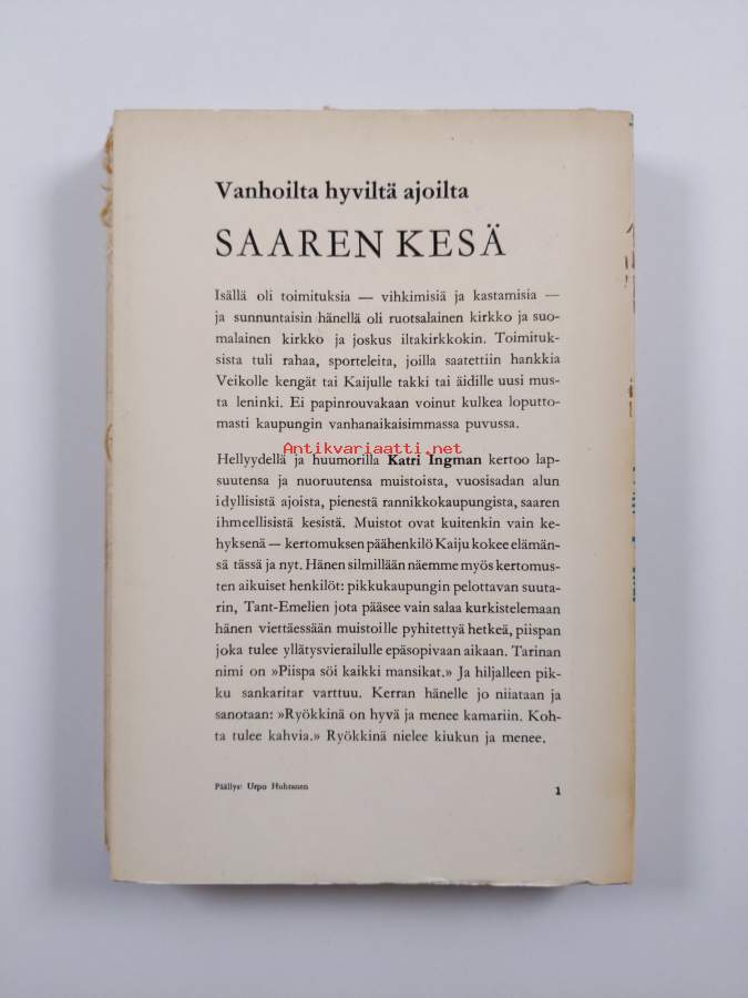 Hyvä. Pienoista kulumaa kansissa, arvosteltavaksi/näytekappale-leima, selkämyksessä hieman vinoutta, selkämyksessä kevyttä lukutaittumaa. yhden aukeaman sivut leikkaamatta auki