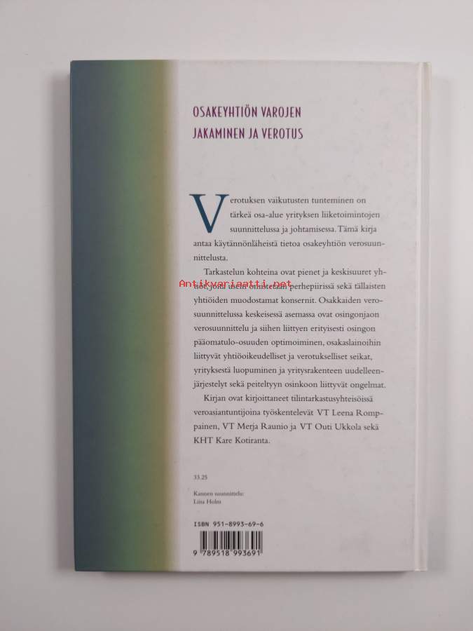 Muu(t) tekijä(t): Leena RomppainenMerkinnät: omistajamerkintä (leima)Asiasanat: osakeyhtiöt, tulovero, yrityskaupat, verosuunnittelu, osingot, voitot, yhtiön purkaminen, peitelty osingonjako, osakaslainat