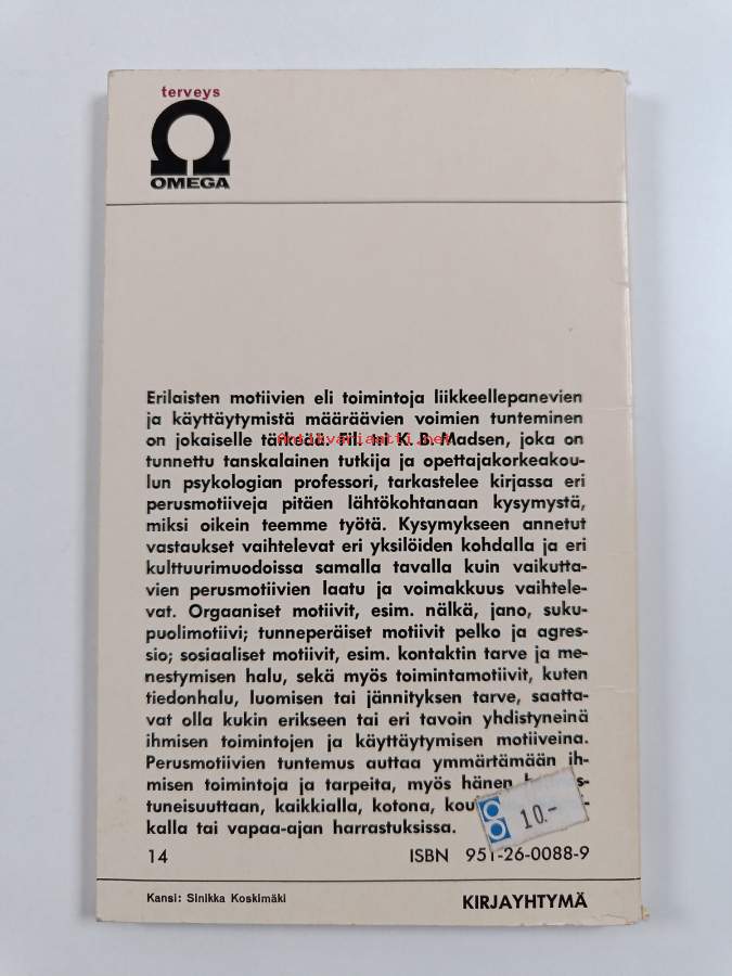 Hyvä. Tarkempi kuntoluokka: K3- ; Pienoista taitejälkeä etukannessa, hieman kulumaa, muutamalla sivulla merkintää, takana vanha hintalappu. selkämyksen alareunassa hiukan pintarepeämää