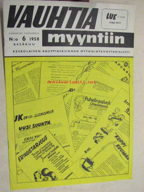 Vauhtia myyntiin 1958 nr 6 -Keskolaisen kauppiaskunnan myynnintehostamislehti sis. mm. artikkelin Tavaratalo Tyynelä Jyväskylässä