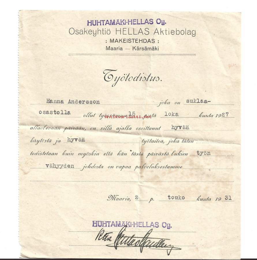 Hellas Oy Makeistehdas / Huhtamäki Oy työtodistus 1931 - firmalomake