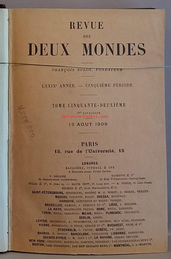 Revue des Deux Mondes 1908-1909. LXXIX Année-Cinquième Pèriode. Tome cinquante-deuxième. (1900-luku)
