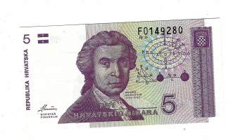 Kroatia 5 Dinara 1991 - seteli / Kroatian tasavalta (kroatiaksi Republika Hrvatska) eli Kroatia (kroatiaksi Hrvatska) on valtio Etelä-Euroopassa, Adrianmeren