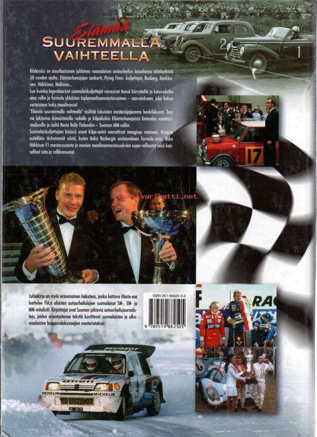 Kirja on ainutlaatuinen juhlateos suomalaisen autourheilun loisteliaista tähtihetkistä 50 vuoden ajalta. Matrikkeli suomalaisen autourheilun MM-, EM- ja SM-mitalistit
