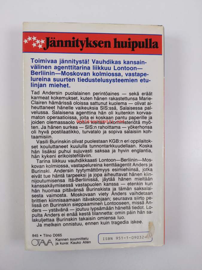 Hyvä. Aivan pienoista kolhua reunoilla, hieman kulumaa kansissa, takana hintalapun jäämää, selkämyksessä hieman vinoutta. Kansipaperin kunto: pientä kulumaa