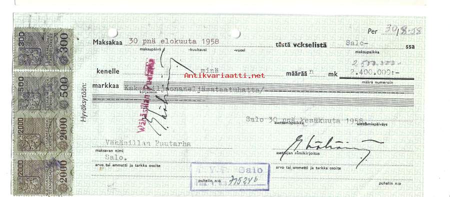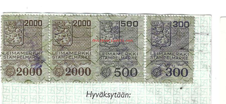 Vekseli 2 500 000 mk / veromerkki 2000 mk + 2000 mk +500 mk+300 mk 1958