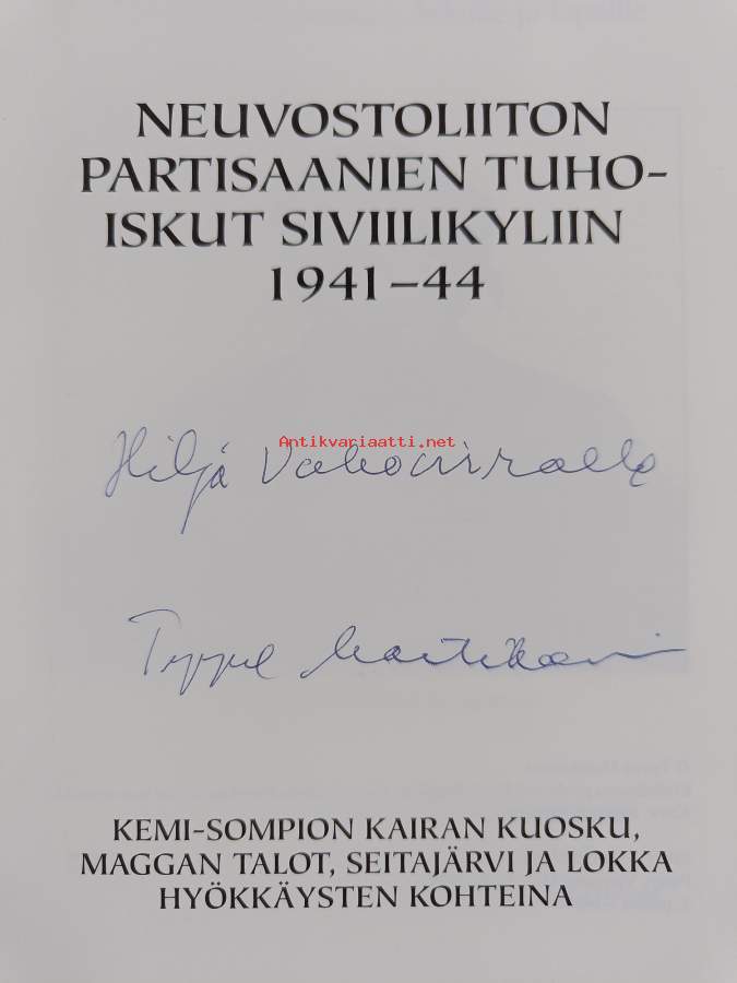 Koko nimi: Neuvostoliiton partisaanien tuhoiskut siviilikyliin 1941-1944 : Kemi-Sompion kairan Kuosku, Maggan talot, Seitajärvi ja Lokka partisaanihyökkäysten kohteina (signeerattu, tekijän omiste)Asiasanat: jatkosota, siviiliväestö, neuvostoliittolaiset, partisaanit
