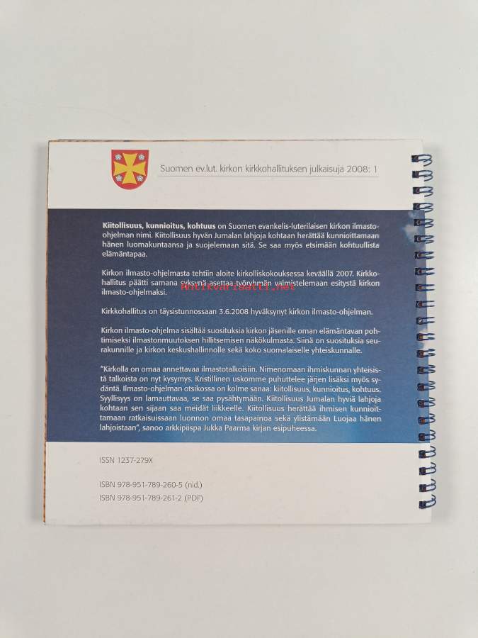 Sarja: Suomen ev.-lut. Kirkon kirkkohallituksen julkaisuja 2008:1Asiasanat: ympäristön tila, evankelis-luterilainen kirkko, ympäristökysymykset, ilmansuojelu, ilmastopolitiikka, ympäristövastuu