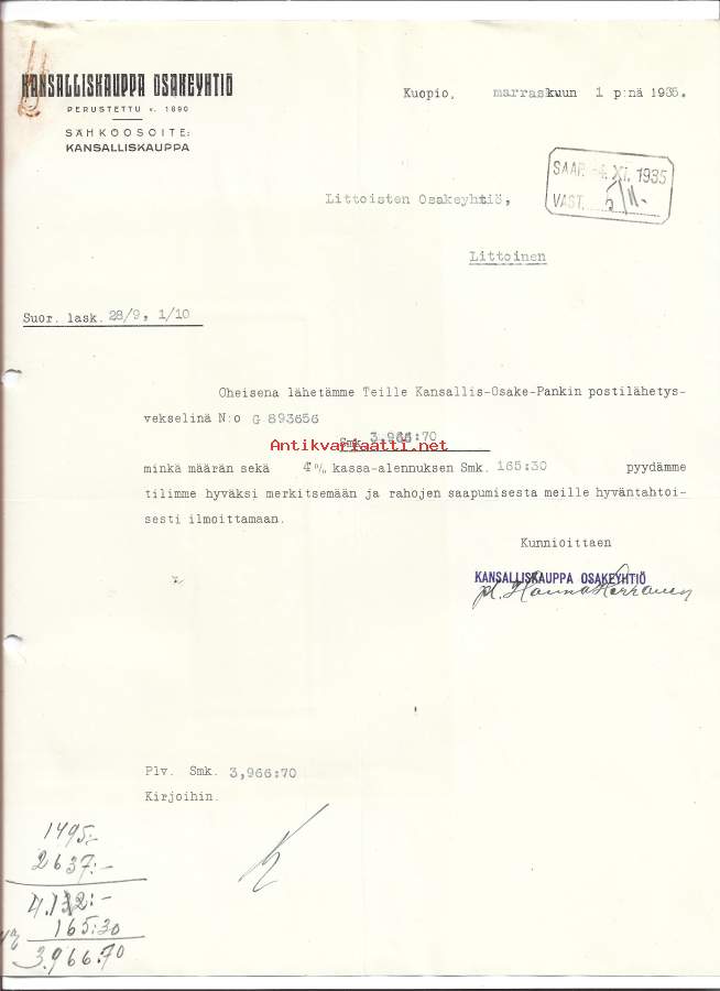 Kansalliskauppa Oy Kuopio 1935 firmalomake