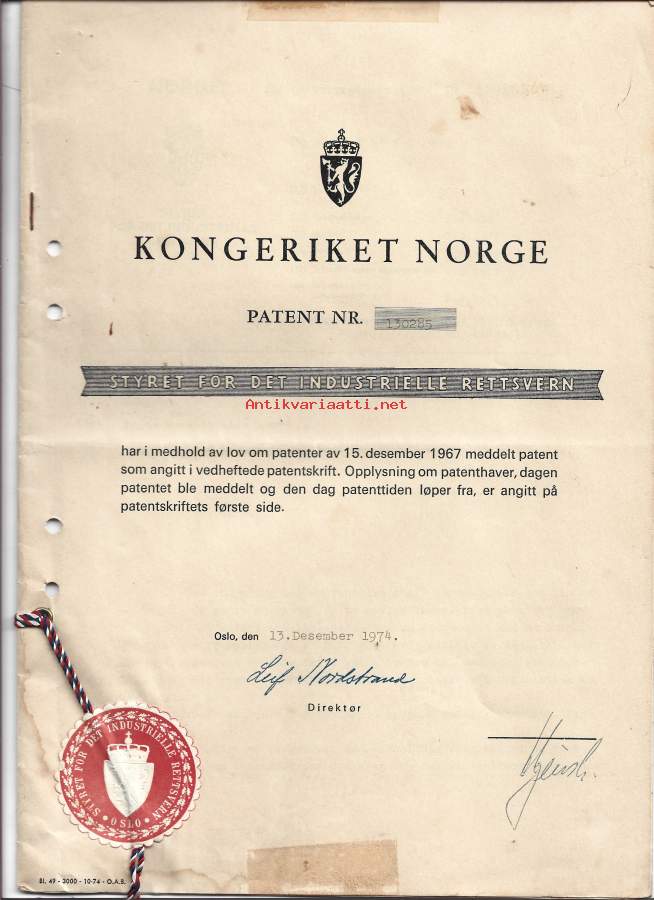 Kongeriket Norge Patent nr 130285 - patentti asiakirja 1974