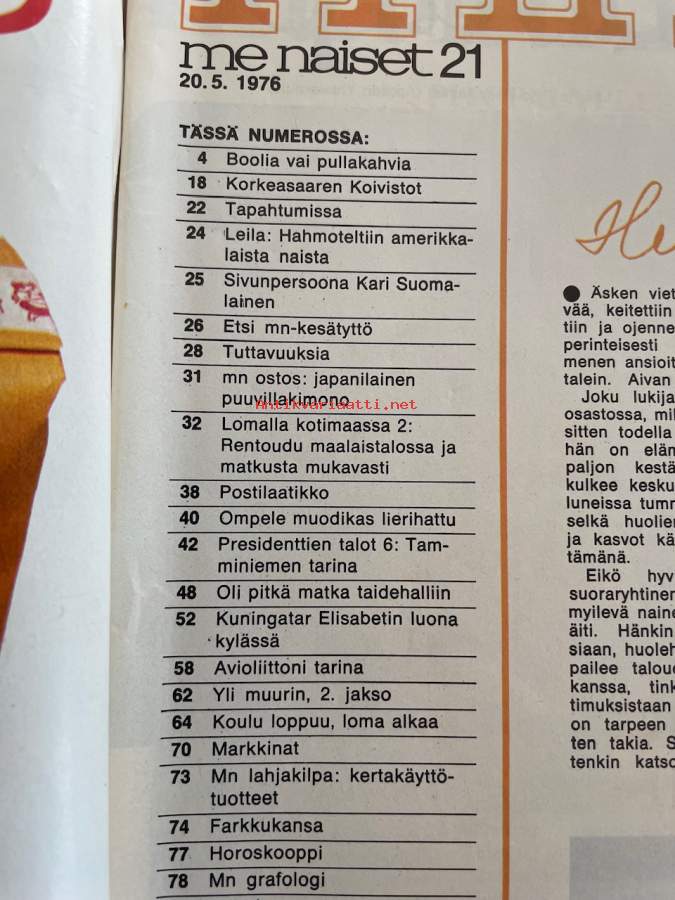 Me Naiset 1976 nro 21 ilmestynyt 20.5.1976, Tamminiemi, Andreas Alariesto, kuningatar Elisabetin luona kylässä