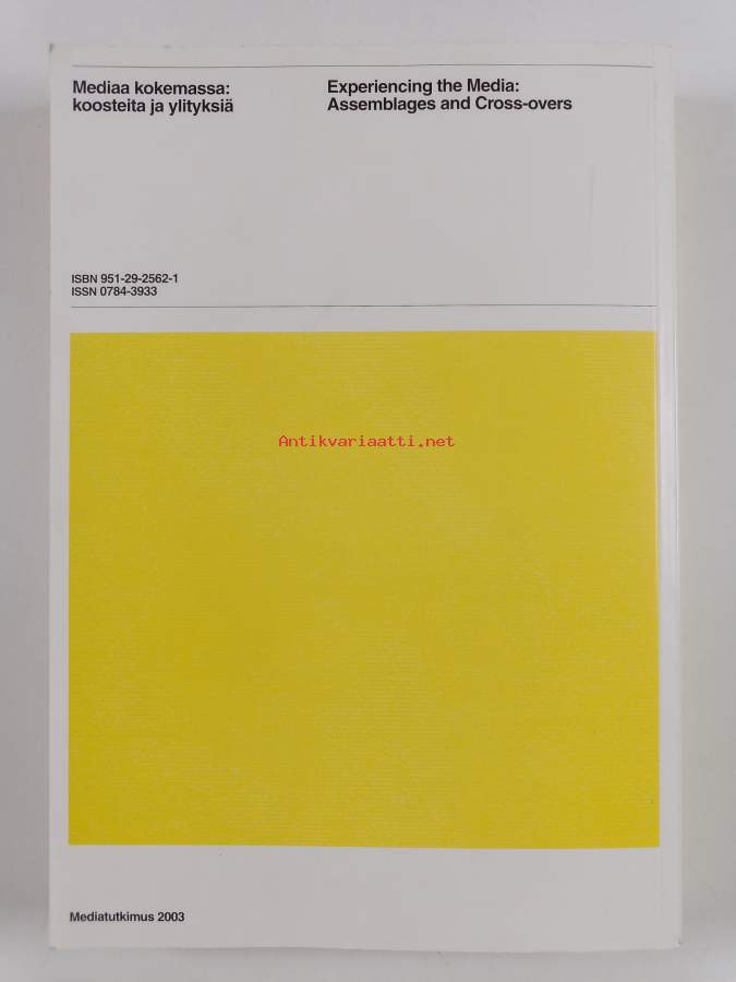 Muu(t) tekijä(t): Pasi Väliaho, Tanja SihvonenSarja: Turun yliopisto. Taiteiden tutkimuksen laitos. Sarja A n:o 53Asiasanat: joukkoviestintä, taide, kokemukset, kulttuuri, tietokonepelit, elokuvat, teoriat, romaanit, joukkoviestimet, teknologia, ruumis, kokeminen, mediakulttuuri, mediatutkimus, audiovisuaalinen viestintä, representaatio