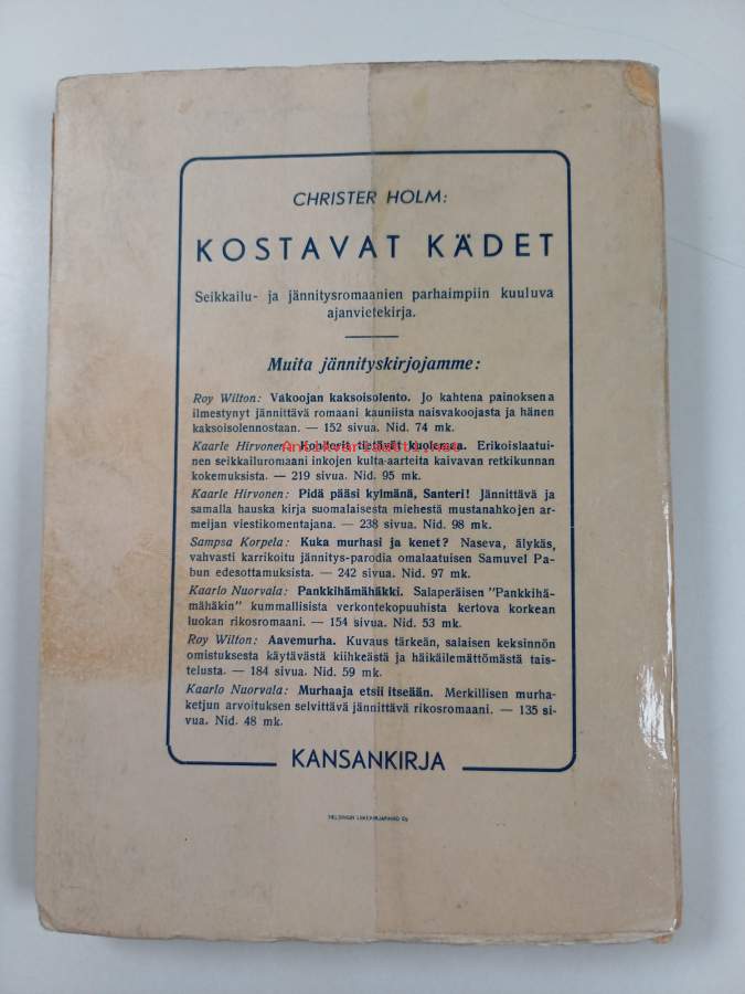 Tyydyttävä. Tarkempi kuntoluokka: K2- ; Pientä kulumaa kansissa, pienoista kolhua reunoilla ja kulmissa, pienoista repeämää ja selkämyksen taitteessa, hieman tahraisuutta takakannessa, selkämyksessä vinoutta, selkämyksessä lukutaittumaa. kansissa osittainen kontaktimuovipäällystys