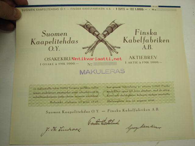 Suomen Kaapelitehdas Oy, Helsinki 1940, 1 000 mk -osakekirja