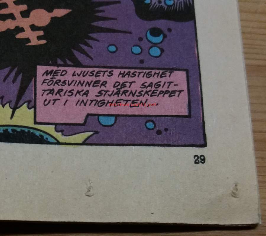 Dimensiot 25 ¤ 17 cm. Ruotsinkielinen. Kuuluu kategoriaan: Palautuslehdet kustantajalle lehtien myyntipisteistä. Sarjakuvalehtien alareunaan muutamille sisäsivuille on tehty siististi lävistykset (noin 2-3 kpl/sivu). Toinen tapa merkata palautuslehdet on vetää punainen väriraita lehden alareunaan. Lehden kuntoluokka ilman lävistyksiä olisi K5 eli lähes uutta vastaava, mutta lävistysten kanssa K4+.