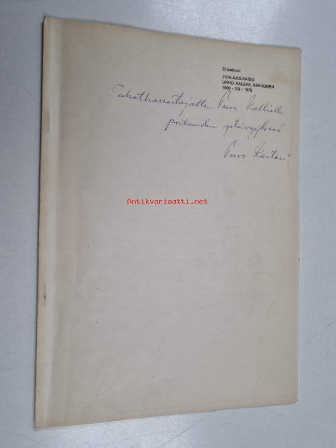 Koko nimi: Näkökohtia presidentin vallankäyttömuodoista erityisesti niiden julkisuutta silmällä pitäen : Juhlajulkaisu Urho Kaleva Kekkonen 3.9.1900-1975 (signeerattu, tekijän omiste)Sarja: Juhlajulkaisu Urho Kaleva Kekkonen 3.9.1900-1975