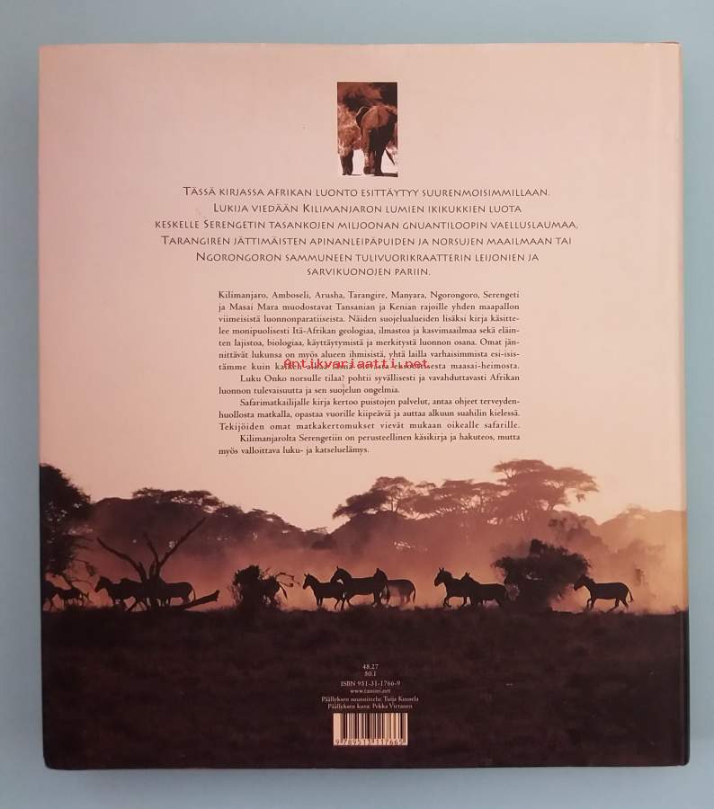 Luontoteos tarkastelee Afrikan luonnonkauneutta ja villieläimiä keskittyen erityisesti alueisiin Kilimanjaro-vuorelta Serengetille. Kuvitettu. Dimensiot 27 ¤ 25 cm.