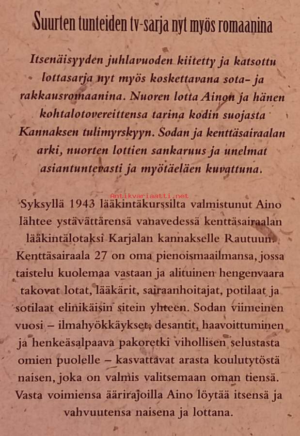 Nuoren lotta Ainon ja hänen kohtalotovereittensa tarina kodin suojasta Kannaksen tulimyrskyyn. Sodan ja kenttäsairaalan arki, nuorten lottien sankaruus ja unelmat asiantuntevasti ja myötäeläen kuvattuna. Dimensiot 22 ¤ 15 cm.