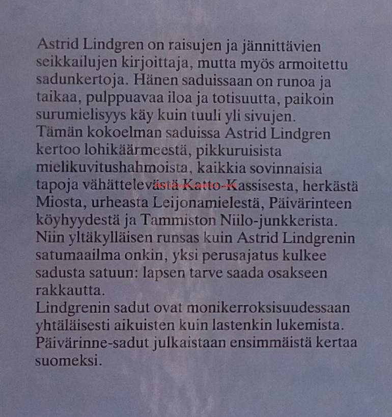 Lindgrenin saduissa on runoa ja taikaa, pulppuavaa iloa ja totisuutta. Saduissa on yksi perusajatus, lapsen tarve saada osakseen rakkautta. Kuvitettu. Dimensiot 21 ¤ 15 cm.