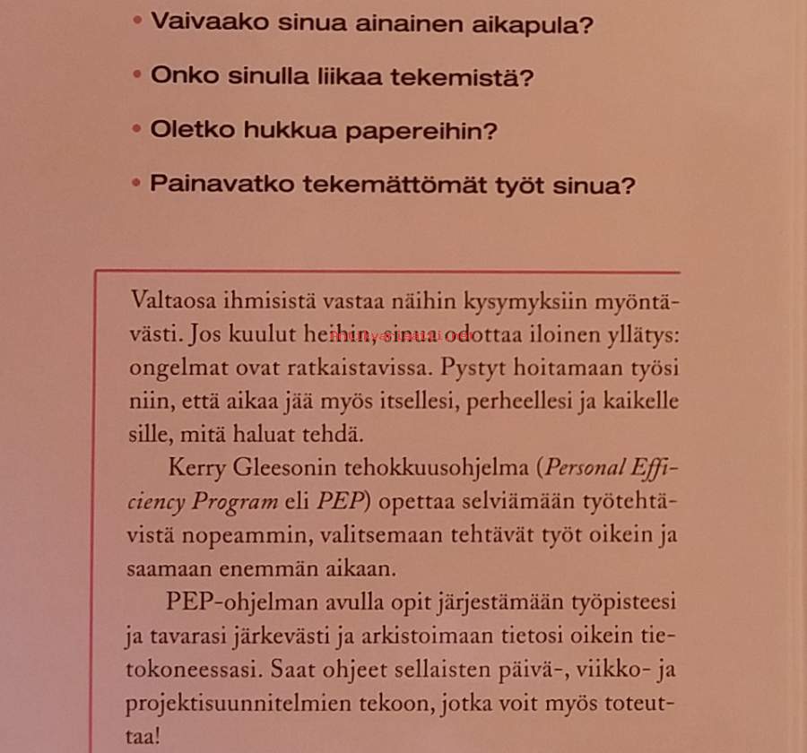 Kerry Gleesonin tehokkuusohjelma (Personal Efficiency Program eli PEP) opettaa selviämään työtehtävistä nopeammin, valitsemaan tehtävät työt oikein ja saamaan enemmän aikaan. PEP-ohjelman avulla opit järjestämään työpisteesi ja tavarasi järkevästi ja arkistoimaan tietosi oikein tietokoneessasi. Saat ohjeet sellaisten päivä-, viikko- ja projektisuunnitelmien tekoon, jotka voit myös toteuttaa!