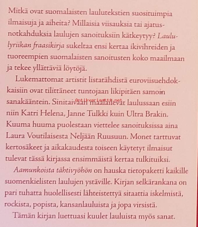 Laululyriikan fraasikirja on ensimmäinen teos, joka käsittelee suomenkielisten laulutekstien käytetyimpiä ilmauksia. Monet tarttuvat kertosäkeet ja aikakaudesta toiseen käytetyt ilmaisut tulevat tässä kirjassa ensimmäistä kertaa kattavasti tulkituiksi. on hauska ja informatiivinen paketti kaikille suomenkielisten laulujen ystäville ja sanoittajille. Kirjan selkärankana on pari tuhatta huolellisesti lähteistettyä sitaattia iskelmistä, rockista, popista, kansanlauluista ja jopa virsistä. Teos Dimensiot 22 ¤ 14 cm.