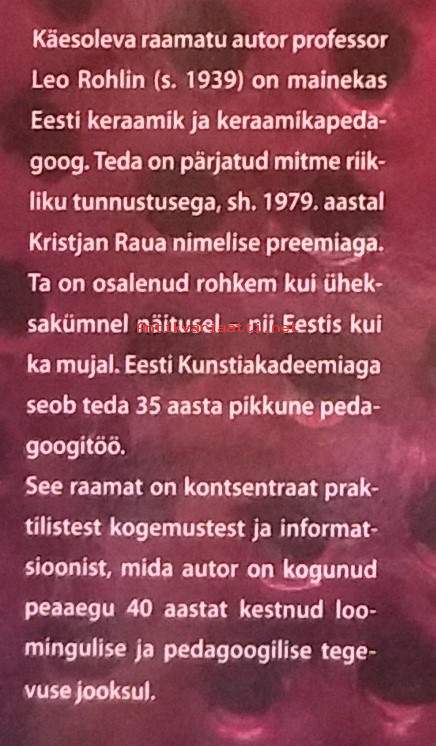 Käsiraamat on asendamatu kõigile keraamikahuvilistele, kes soovivad selle alaga põhjalikumalt tegelda. See on eeskätt teatmeteos, milles käsitletakse kokkuvõtlikult keraamika ajalugu, vaadeldakse lühidalt nüüdiskeraamika suundumusi ja tutvustatakse põhjalikult mitmesuguseid keraamikatehnoloogiaid, s.h keraamika valmimise tehnoloogilist protsessi, vajaminevaid materjale ja seadmeid, keraamika liike ja nende iseärasusi, erinevate põletusrežiimide jaoks kasutatavaid keraamiliste masside ja glasuuride koostisi. Lisatud on ka tabelid keraamikas tarvitusel olevate toorainete kohta, keraamikatehnoloogia seletav sõnastik ja lühike peatükk keraamikaga tegelemisel vajalikust tervisekaitsest. Kuvitettu. Dimensiot 23 ¤ 18 cm.